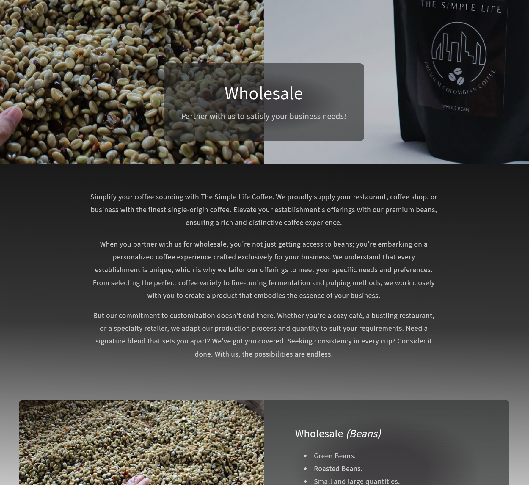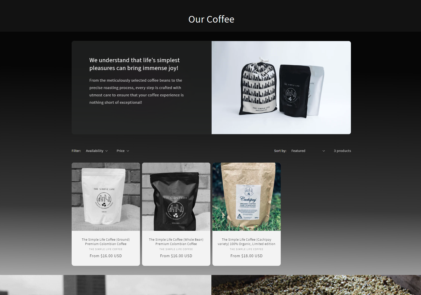 The Simple Life Coffee is a 100% online business. We want to be able to offer all of our products and services within our e-commerce site. Due to business purposes, I decided to create my website using Shopify, this platform allows me to integrate social media, shipping labels, google ads, SEO, and analytics, all within one place. Shopify gives you a lot of tools all accessed within one dashboard. Even though Shopify helps with many digital aspects of business management, it sacrifices a lot of creative freedom with its static website templates. It has been a challenge to give the feel of my brand to my Shopify store due to the template constraints. I made some tweaks to the HTML & and CSS code in some sections and I also played around with different features to be able to give the website the elegant and aesthetically minimal design that I am aiming for.