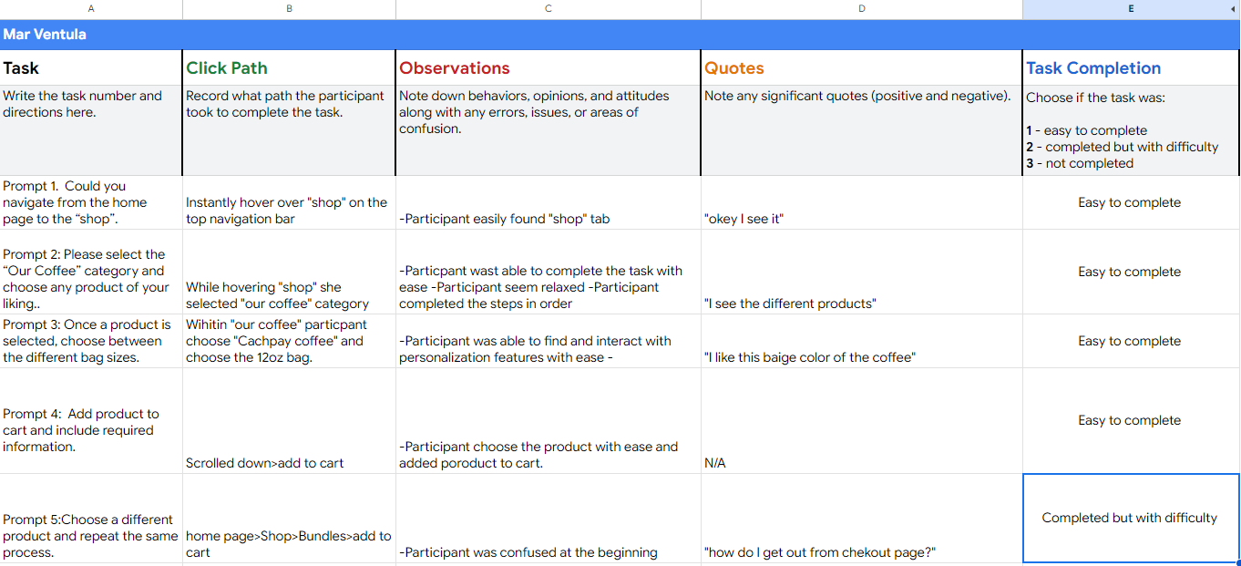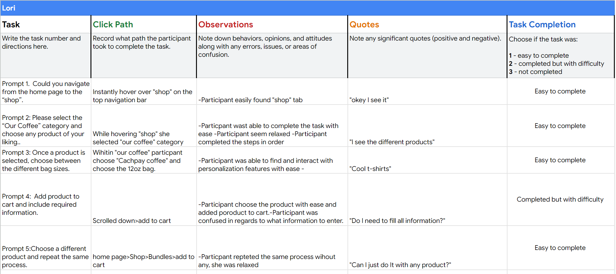 Ideally, our participants are people who appreciate high-quality coffee, care about sustainability and how the coffee is produced, and if production adheres to human rights. The user persona describes our “ideal customer” based on our market research and the niche market that we are representing. Obviously due to the nature of these usability tests where we are not previously selecting “ideal candidates,” we are trying to test if the overall website experience is accessible to all. Through the usability test 3 out of 5 participants fortunately were closely related to our user persona.